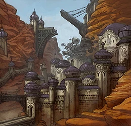 Ruled over by a council of enigmatic and calculating figures, games of politics go hand in hand with the pursuit of knowledge. The city is still being built, and seems to be under constant construction.