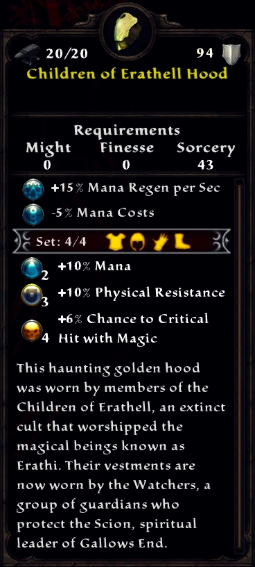 - This haunting golden hood was worn by members of the Children of Erathell, an extinct cult that worshipped the magical beings known as Erathi. Their vestments are now worn by the Watchers, a group of guardians who protect the Scion, spiritual leader of Gallows End.