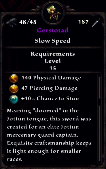 - Meaning "doomed" in the Jottun tongue, this sword was created for an elite Jottun mercenary guard captain. Exquisite craftsmanship keeps it light enough for smaller races.