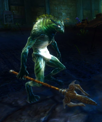 Murghan are lizard-like creatures most commonly found around large bodies of water, rivers, or in caves and swamps. Murghan are in fact children of a Banshaen, but it is unknown whether they mature and transform into one. They wield a lightning-element trident, and are resistant to lightning.