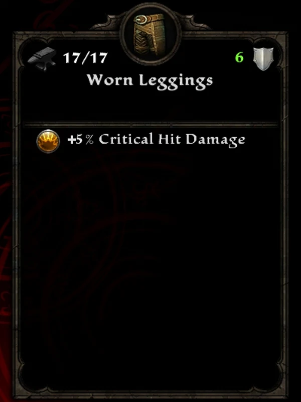The Worn Leggings are part of an aesthetically-matching "set" of armor pieces obtained in Allestar Tower. Wearing all of them does not add any extra stat bonuses aside from those already listed.