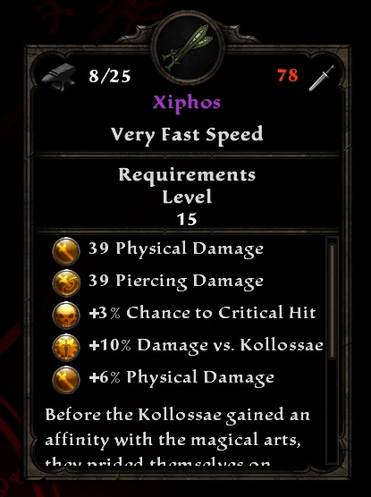 - The Xiphos' stats (base damage & requirements) are scaled according to the Fateless One's experience level.